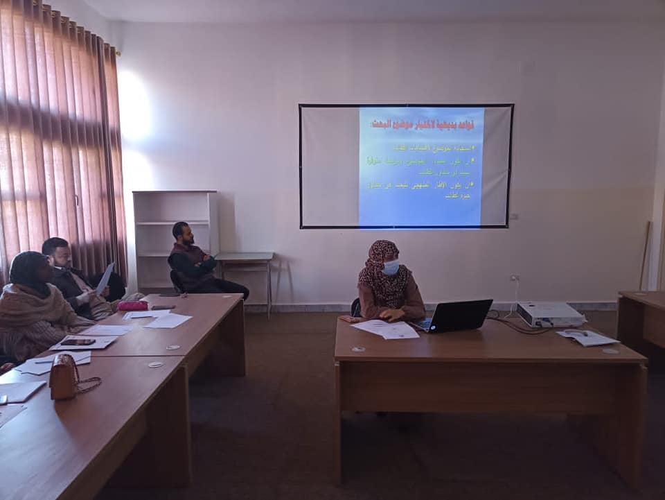 أقيم اليوم الاربعاء الموافق 2022/12/21 م بقاعة التدريب بالمعهد إلقاء محاضرة بعنوان : “القواعد البديهية في أختيار مشرع التخرج” . للاستاذة منى والي . تهدف إلى تعريف طلبة الفصل الخامس والسادس بالقواعد العامة لكتابة مشروع التخرج.